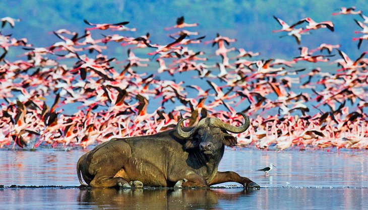 Orta Kenya’daki Nakuru Gölü Milli Parkı, devasa pembe flamingo sürüleriyle ünlüdür. Kuşlar, park alanının neredeyse üçte birini kaplayan Rift Vadisi soda göllerinden biri olan Nakuru Gölü’nde akın ediyor. Park aynı zamanda Afrika’nın en büyük sütleğen şamdan ormanını da koruyor. Bu uzun, dallanan sulu meyveler bölgeye özgüdür ve kurak manzaralara çarpıcı bir dokusal unsur sağlar.