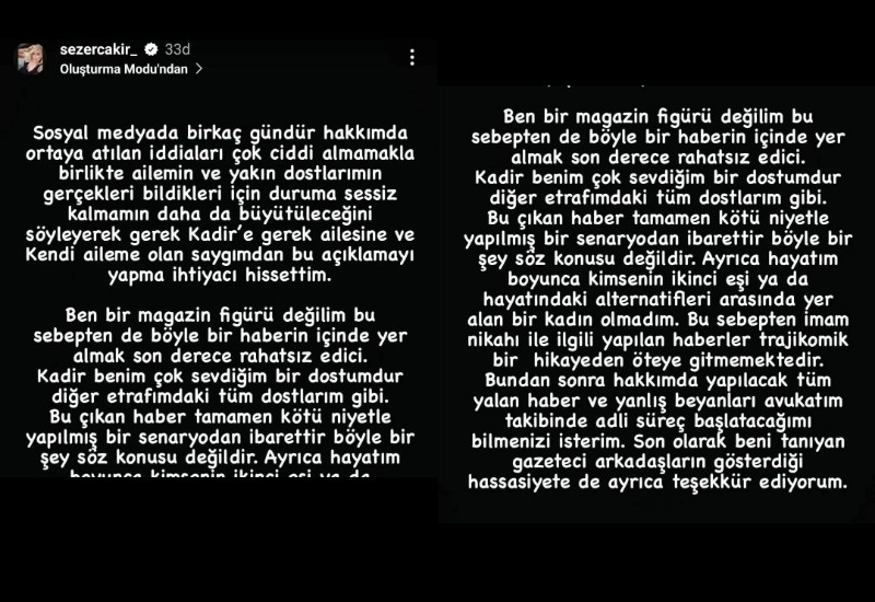İhaneti kabul etmeyen çift bir destekte Sezer Çakır’dan geldi. Sosyal medyasından açıklama yapan Sezer Çakır şunları söyledi.
