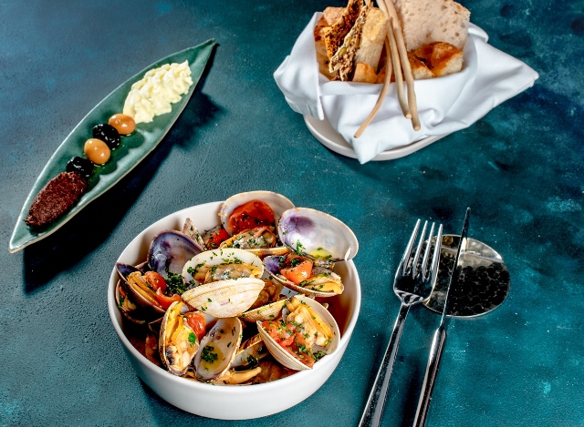 Chardonnay şaraplı kum midye, sarımsaklı ekmek ve limonla hazırlanan “SAUTE’ DI VONGOLE” ile midyenin doyulmaz tadını hissederken; ekşi mayalı hamur, manda sütü mozzarella, renkli şeker domatesle pesto sosa eşlik eden Grana Padano dilimleriyle tadı damaklarda kalan “PIZZETTA POMODORINI”