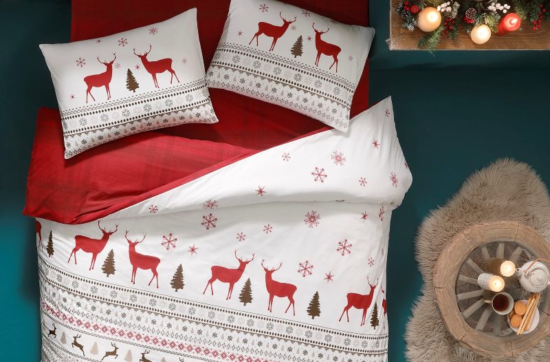 Özel bir baskı teknolojisi sayesinde gündüzleri gün ışığını toplayan, geceleri ise bu ışığı yansıtan Taç Glow özellikli nevresim takımı, beyaz ve kırmızı rengin hakimiyetindeki ren geyikli yılbaşı temasıyla yeni yılda odaları süslüyor. Çift kişilik nevresim takımı, tasarımının yanı sıra yumuşak dokusuyla soğuk kış akşamlarına sıcak bir dokunuş katıyor. Ren geyikleri, kar taneleri ve çam ağaçlarının süslediği Belly Glow Nevresim Takımı, yeni yılı ışıltılı bir şekilde karşılamak isteyenlerin favorisi oluyor!
