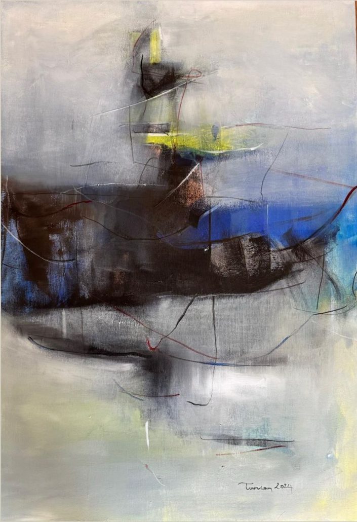 Amorf biçimlerin konturü olmaktan çok her an değişmeye ve başka bir şeye benzemeye meyilli çizgileri, birbirini yok etme çabası içinde; hayali  ya da gerçek, ne olduğunu tasavvur edemediğimiz insanlar, nesneler, ağaçlar gibi biçimlerin gölgeleri, ecinnileri olarak tuval yüzeyinde gezintiye çıkıyorlar.